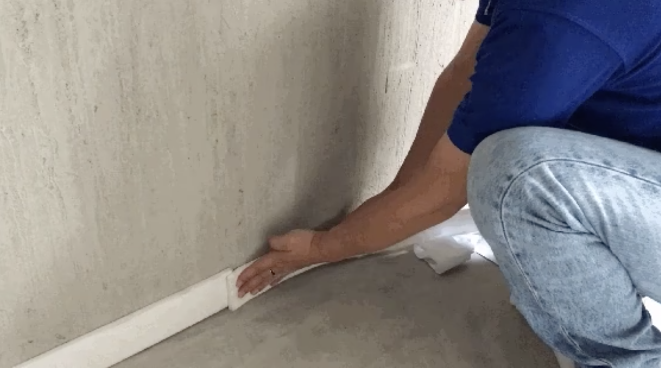 4、墻腳有線管時(shí),邊條緊貼著線管上方粘貼;
